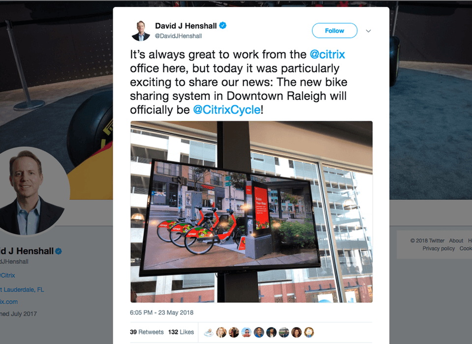 Multinational software leader Citrix has announced that the company will be the title sponsor of the City of Raleigh’s upcoming bike share system. The company’s involvement in this project demonstrates a strong commitment to encouraging sustainable, clean-energy transportation across the City of Raleigh and greater North Carolina.